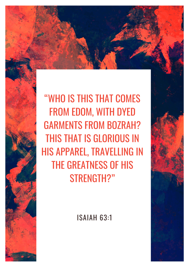 Edom (Edomites) is the descendant of Esau (Gen. 36:43). Edom means red. The origin of the word ‘Edom’ is “adom” (meaning red & ruddy). It is from ‘adom’ that we get the name ‘Adam’ (i.e. to be red or to show blood). Thus, it’s written of Esau that “the first came forth red” (Gen. 25:25). We can understand then that this was what had stained the Lord’s garment.